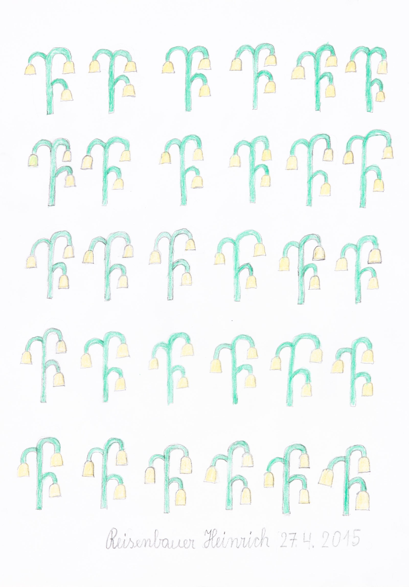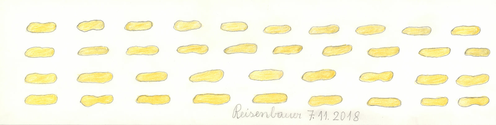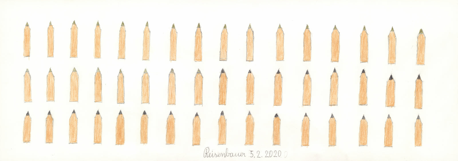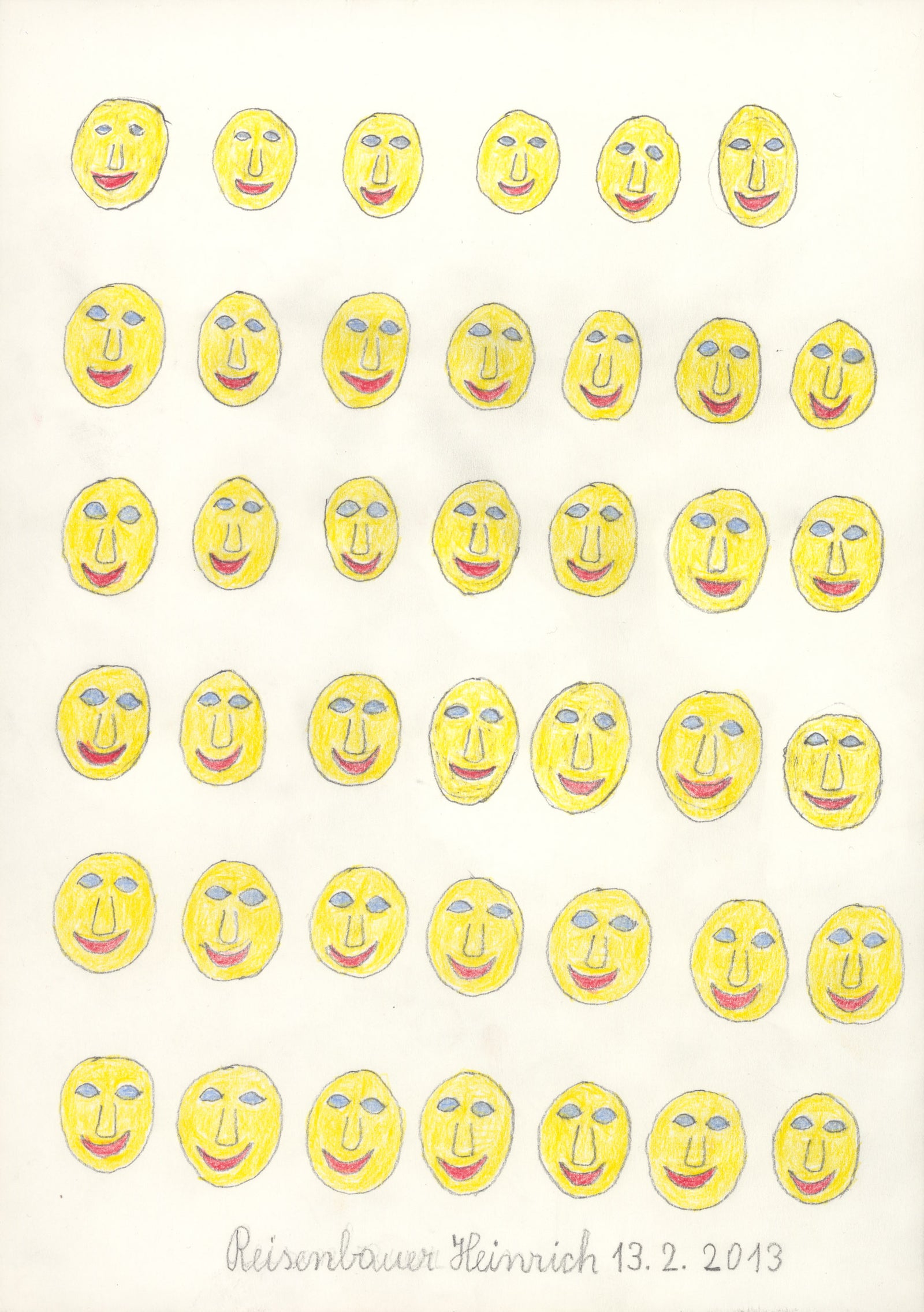 Heinrich Reisenbauer was born in 1938 in Kirchau, Austria, and has been living in the House of Artists in Gugging since 1986. Reisenbauer became famous for his serigraphic depictions, which accurately portray objects or other simple motifs, side by side and beneath one another. The artist draws from left to right with pencil and coloured pencil on paper; he uses acrylic and Edding marker for his large-format works on canvas. In 1990, he and the Gugging Artists were awarded the Oskar Kokoschka Prize. His works can be found in the Museum of Everything, England, the LaM, France, and in the Helmut Zambo Collection, Germany.