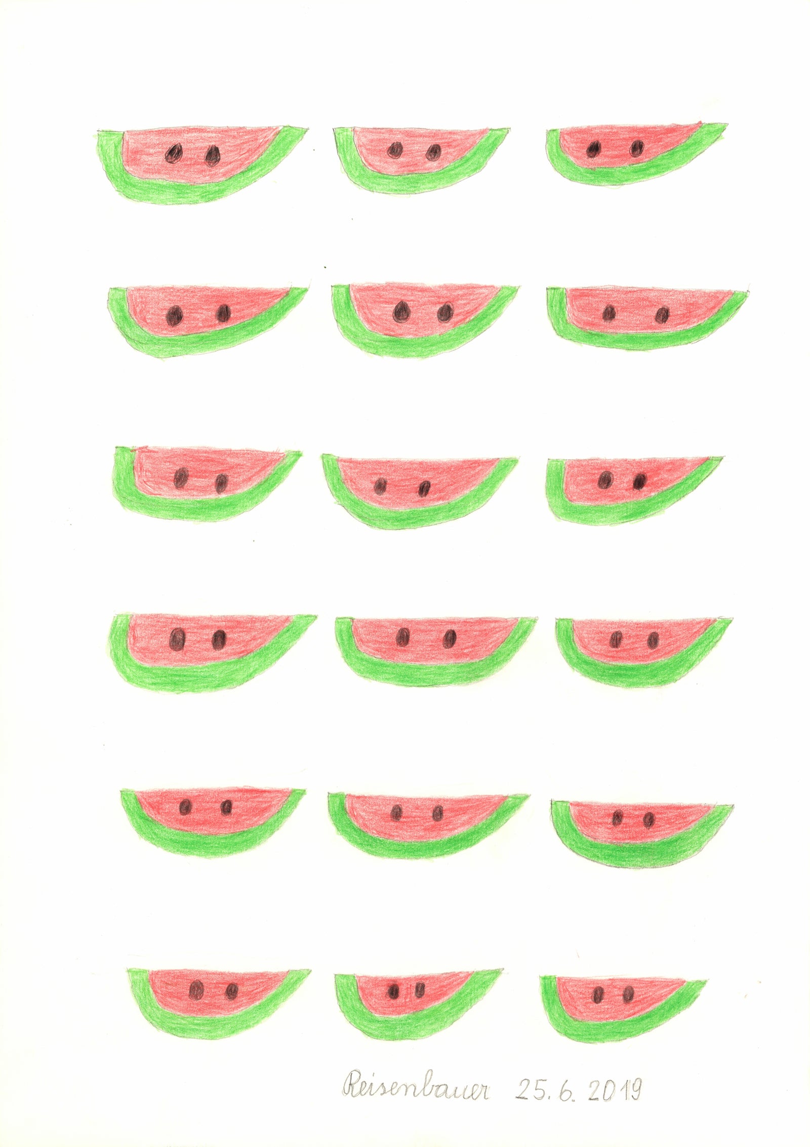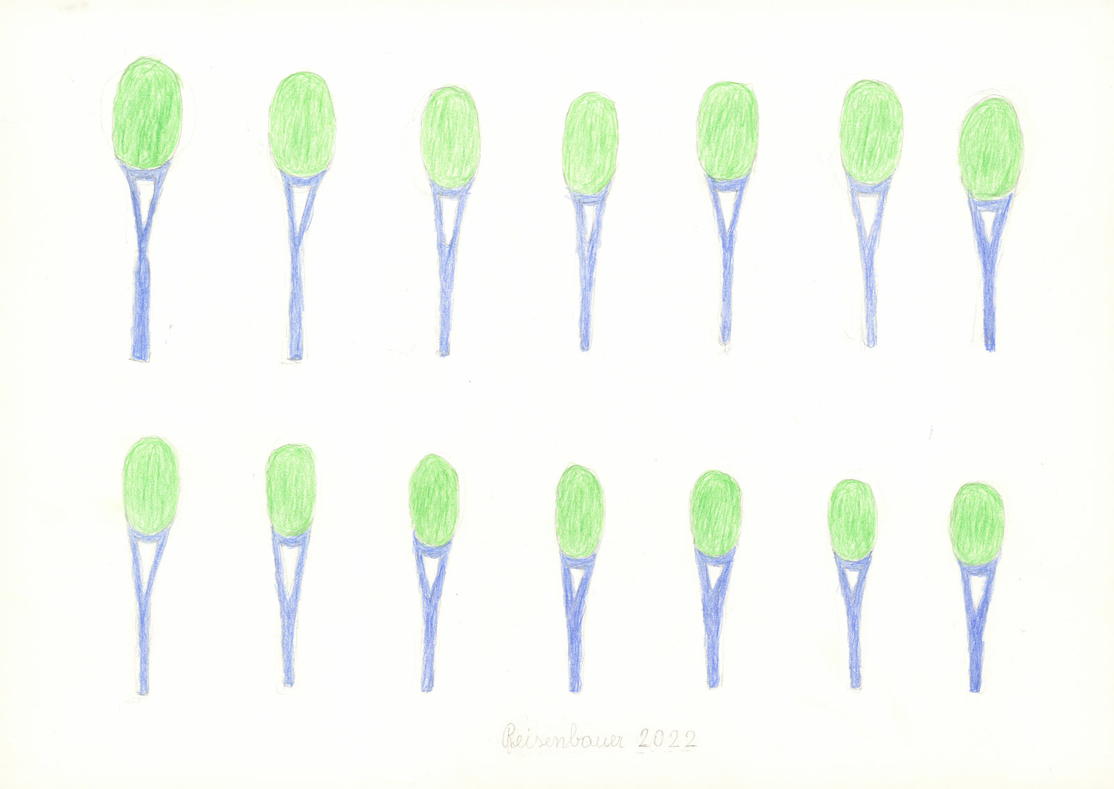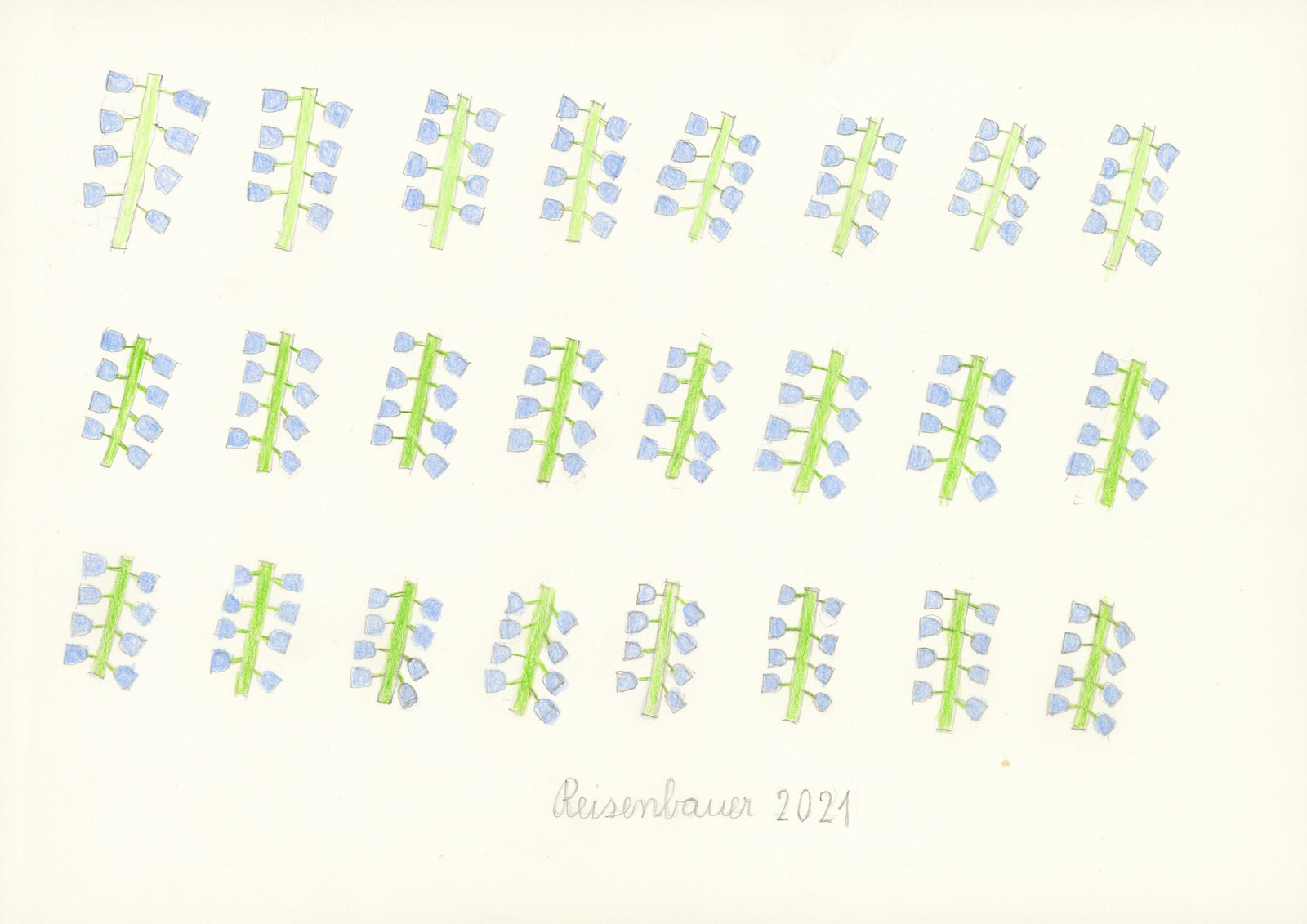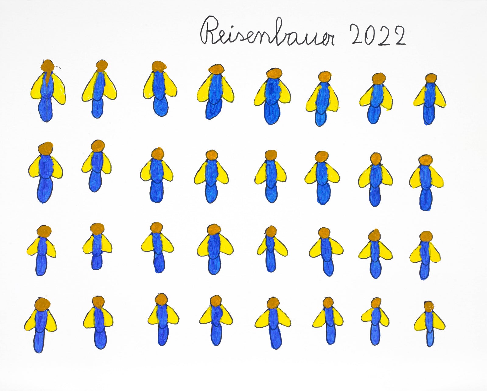 Heinrich Reisenbauer was born in 1938 in Kirchau, Austria, and has been living in the House of Artists in Gugging since 1986. Reisenbauer became famous for his serigraphic depictions, which accurately portray objects or other simple motifs, side by side and beneath one another. The artist draws from left to right with pencil and coloured pencil on paper; he uses acrylic and Edding marker for his large-format works on canvas. In 1990, he and the Gugging Artists were awarded the Oskar Kokoschka Prize. His works can be found in the Museum of Everything, England, the LaM, France, and in the Helmut Zambo Collection, Germany.