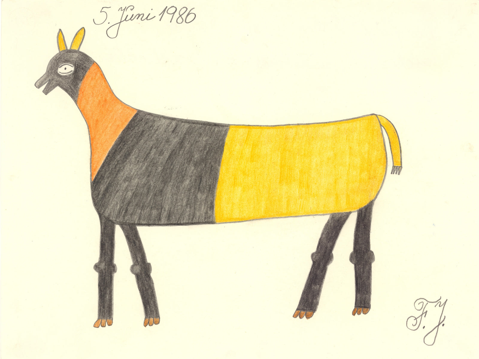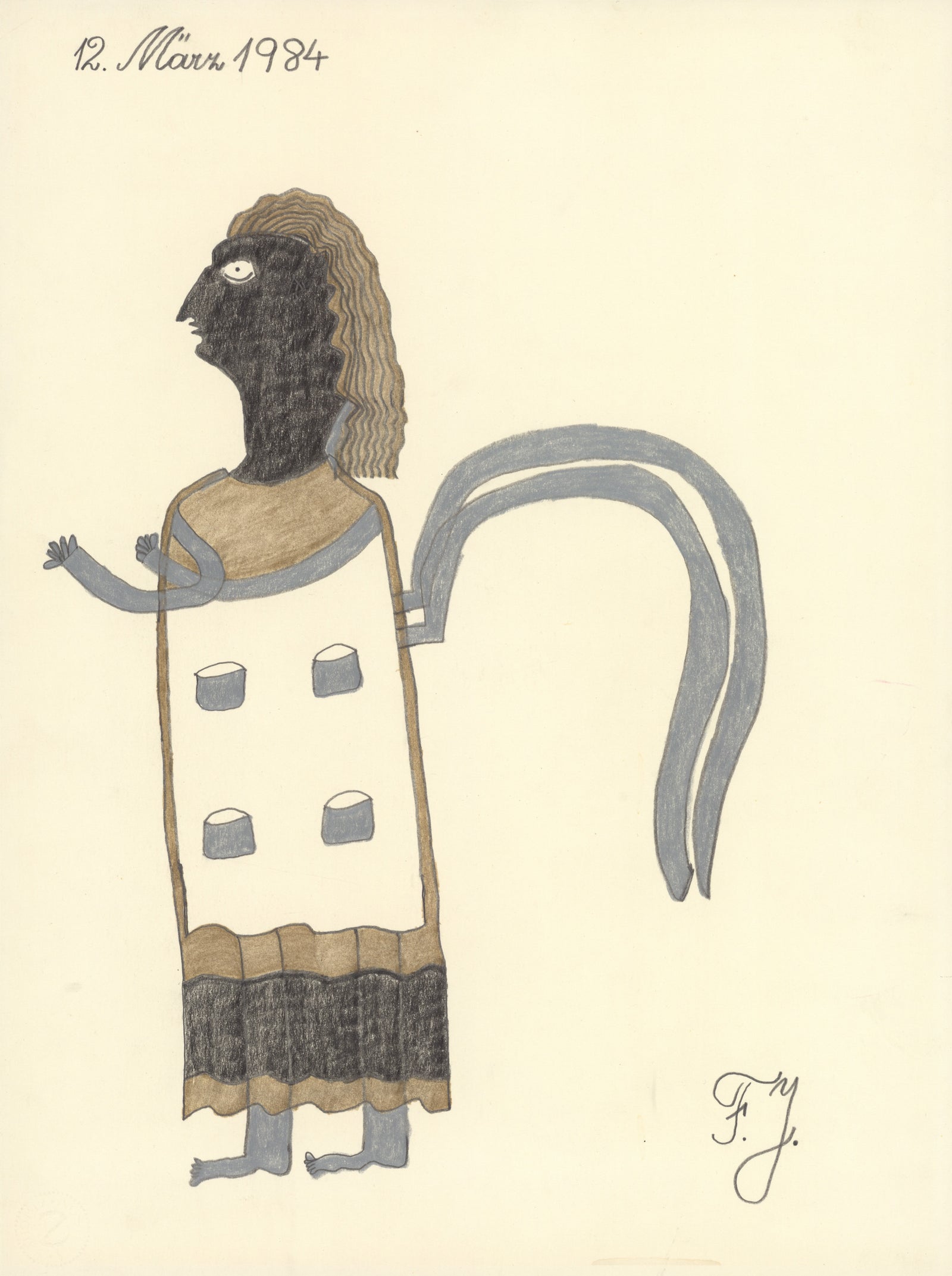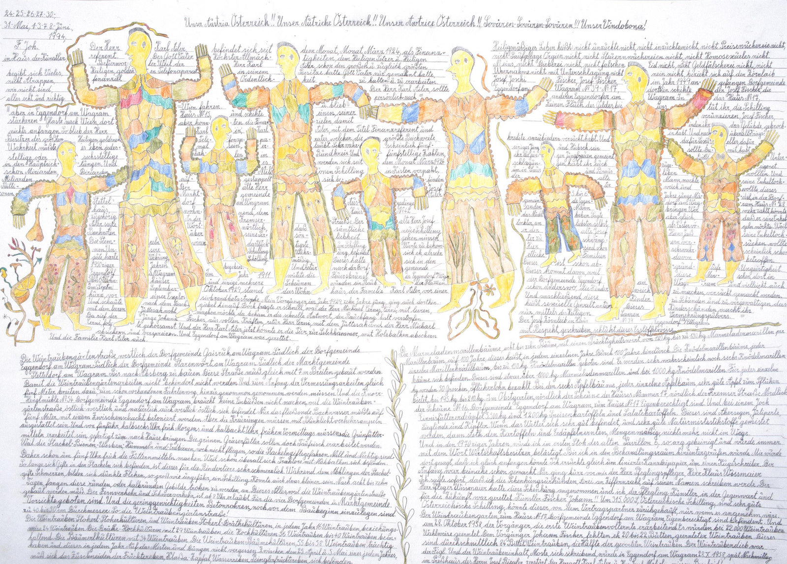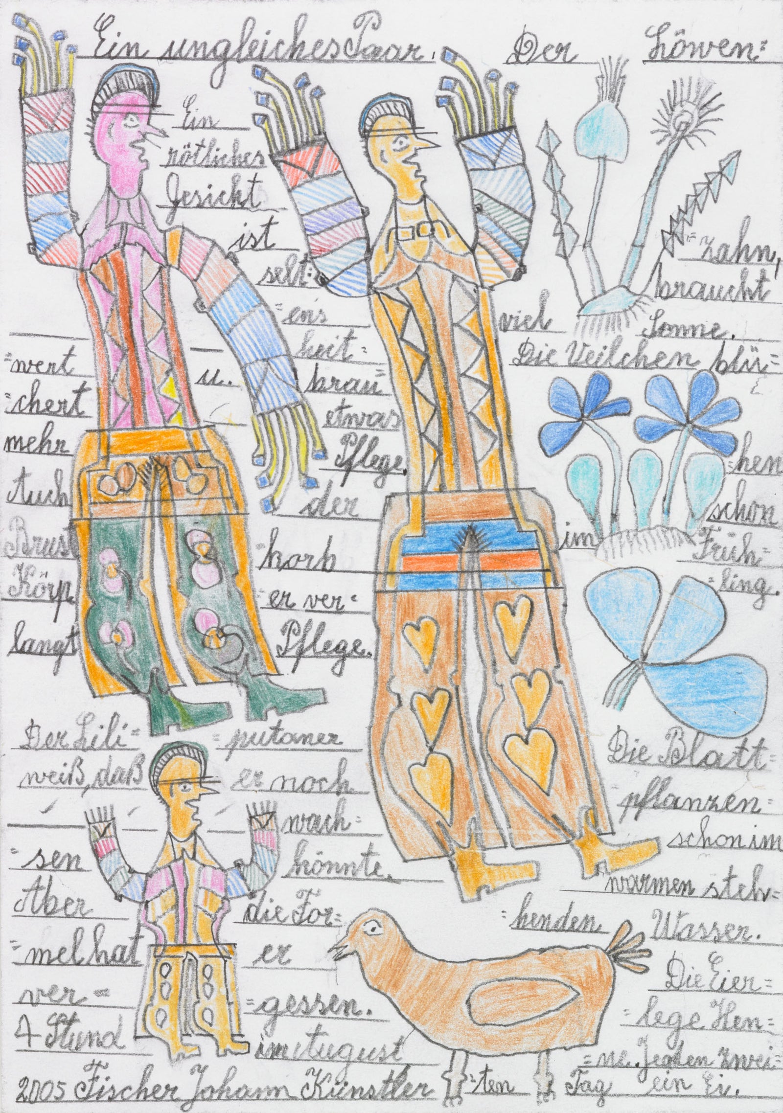 Johann Fischer was born in 1919 in Kirchberg am Wagram, Austria, and lived in the House of Artists in Gugging from 1981 until his death in 2008. In the beginning, he depicted individual objects, people or animals – in pencil and very stylised. In the course of time, his works became increasingly colourful and, after structuring his motifs, he began to inscribe them. In 1990, he and the Gugging Artists were awarded the Oskar Kokoschka Prize. His paintings can be found in the Museum de Stadshof, Netherlands, in the Museum of Outsider Art, Russia, and in the Helmut Zambo Collection, Germany, among others.