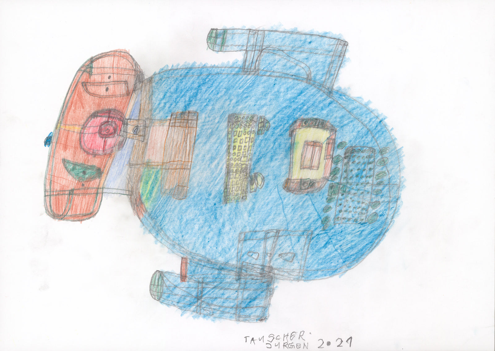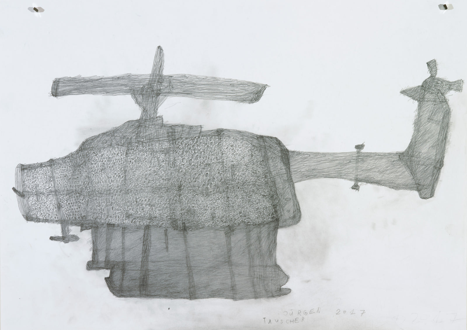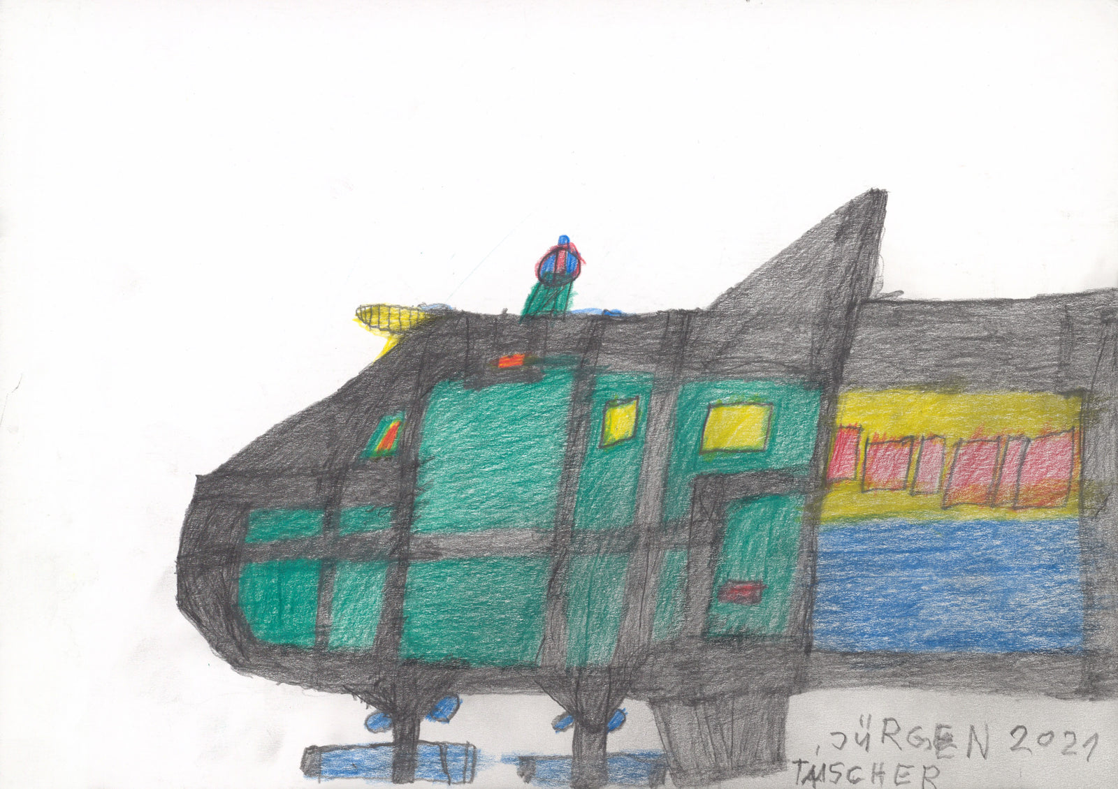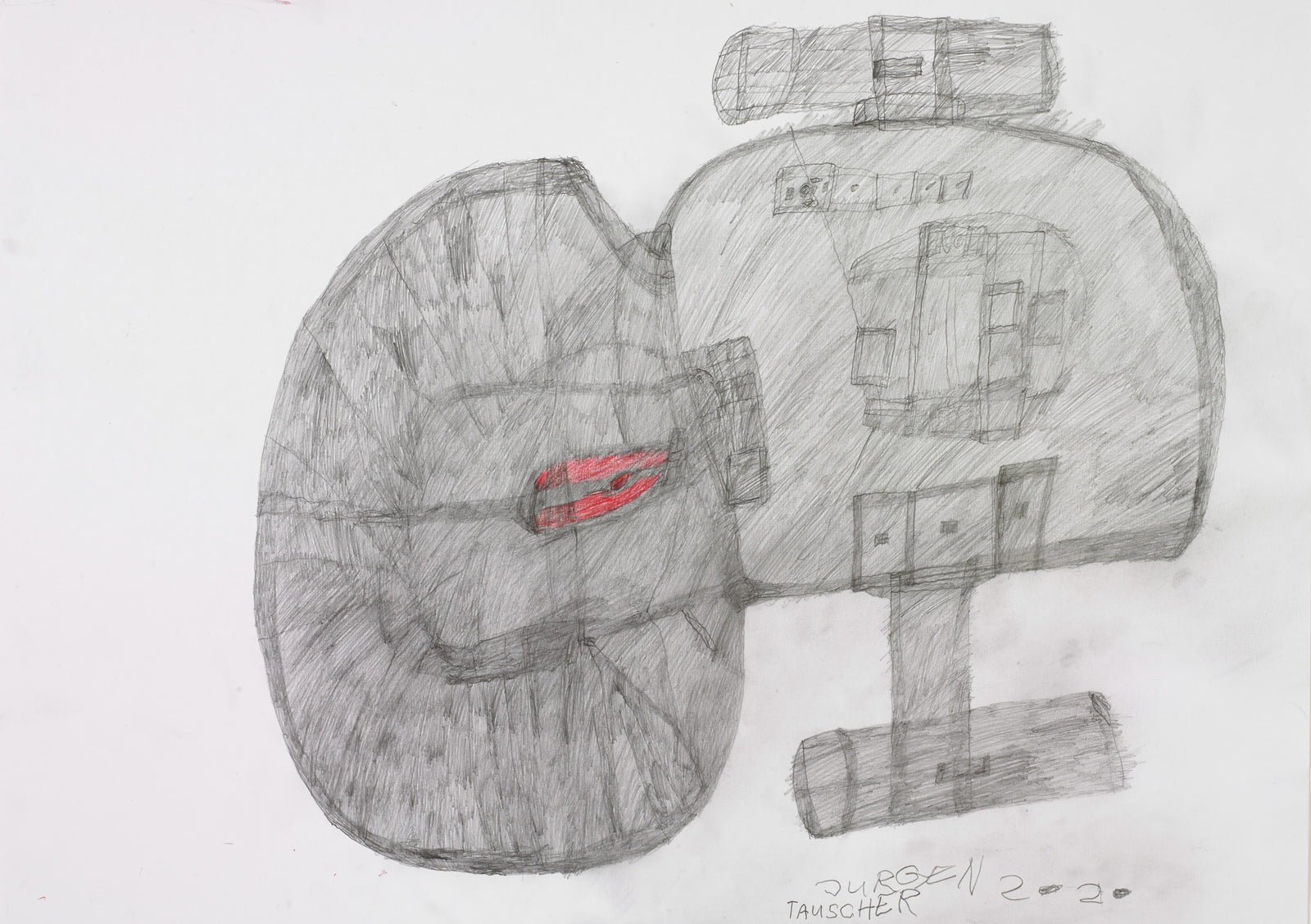 Jürgen Tauscher was born in 1974 in St. Pölten, Austria, and has been living in the House of Artists in Gugging since 2012. Tauscher is interested in technology, action, adventure and science fiction – astronaut capsules, airplanes and helicopters are his main themes. The artist works primarily with pencil on paper – only occasionally he uses coloured pencils. In addition to all the means of transportation such as airplanes, spaceships and special cars, now and again you can also detect buildings. The cathedrals, houses or skyscrapers are integrated into his pictures as backdrops or arranged as main motifs. His works can be found in the Hannah Rieger Collection, Austria, and in the Diamond Collection, Austria.