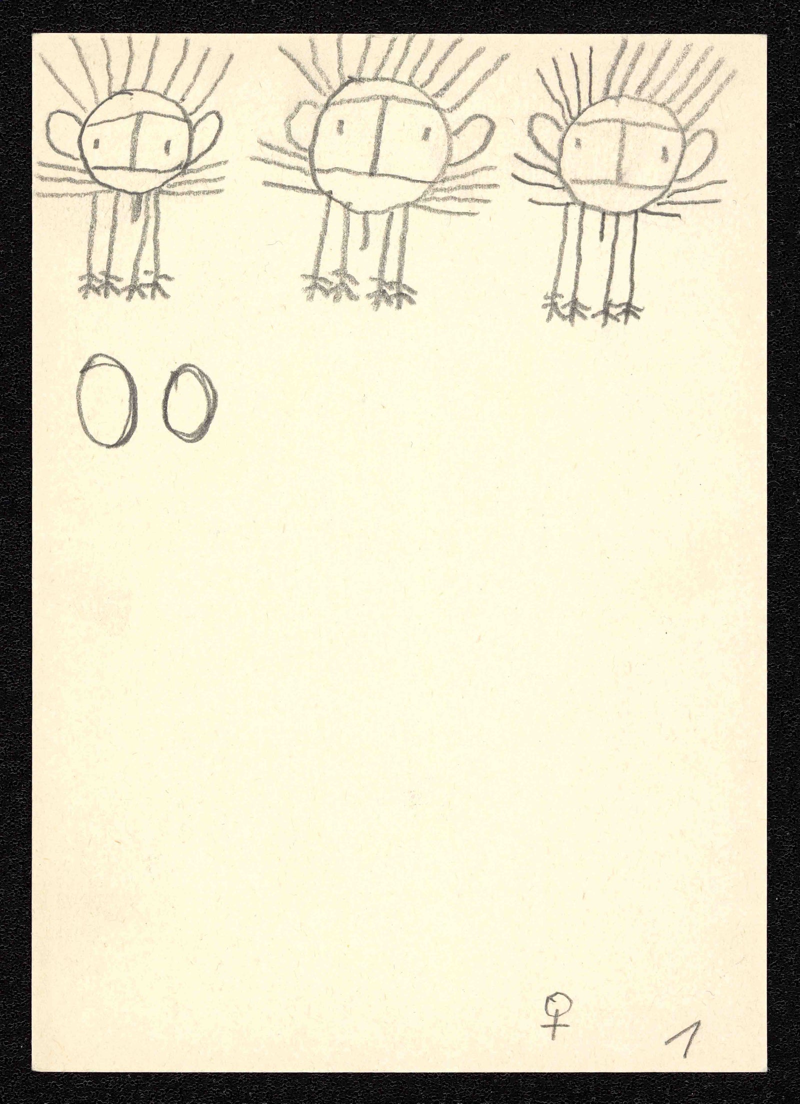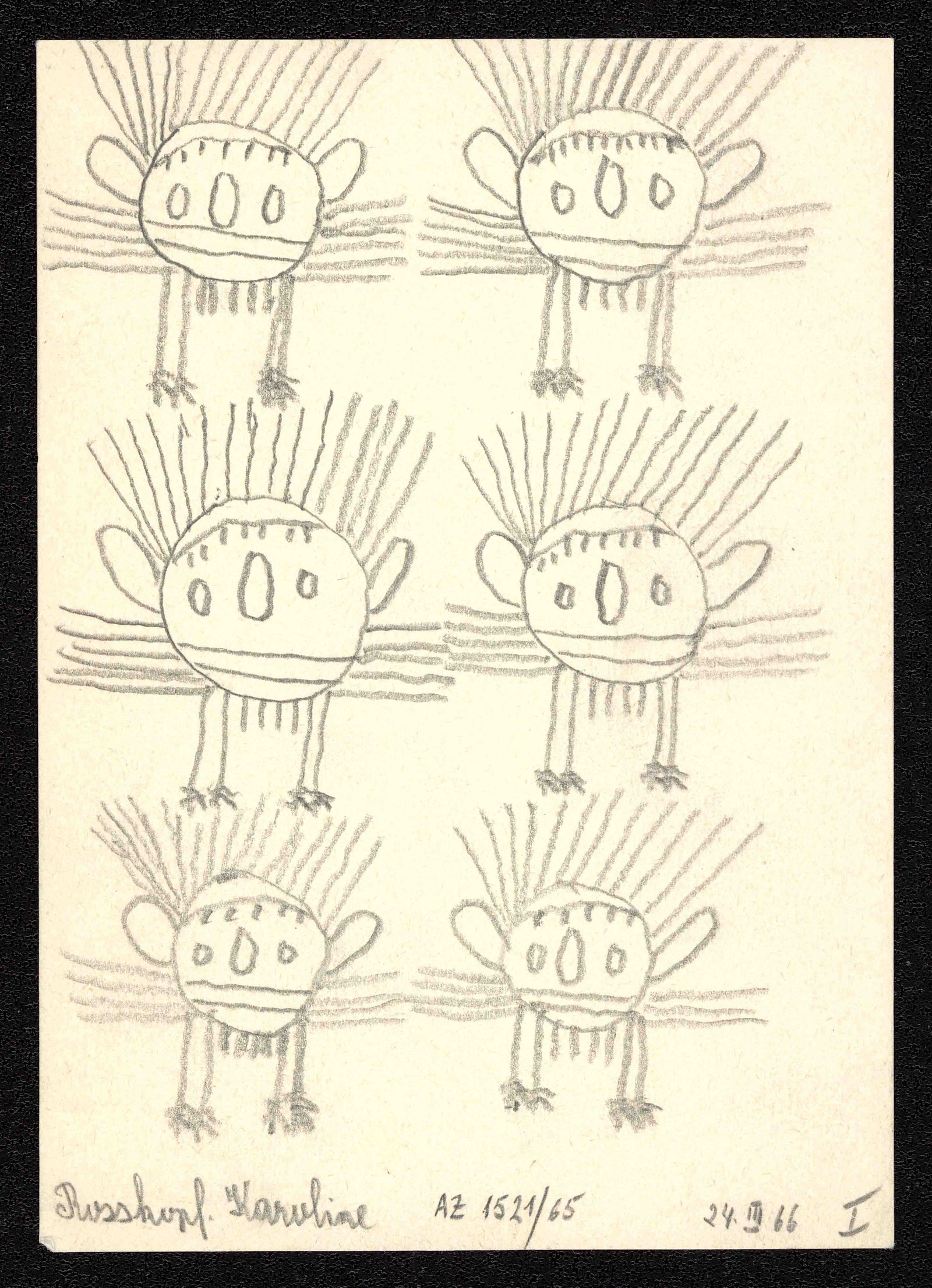 Karoline Rosskopf was born in 1911 in Austria (time of death unknown) and left only a small oeuvre of depictions of cephalophods and cat people behind. With a clear stroke, the largely unknown illustrator created simple-looking illustrations of great charisma. These are so impressive and independent that her works can be found in the Collection de l’Art Brut, Switzerland, the Lentos Art Museum, Austria, and in the Hannah Rieger Collection, Austria.