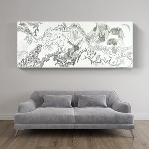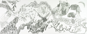 Despite its scale and density, the composition remains open. Empty space cuts through the drawing, creating contrast and breath between clusters of imagery. There is no clear narrative, but instead a constant unfolding of possibilities that ask the viewer to explore without conclusion.