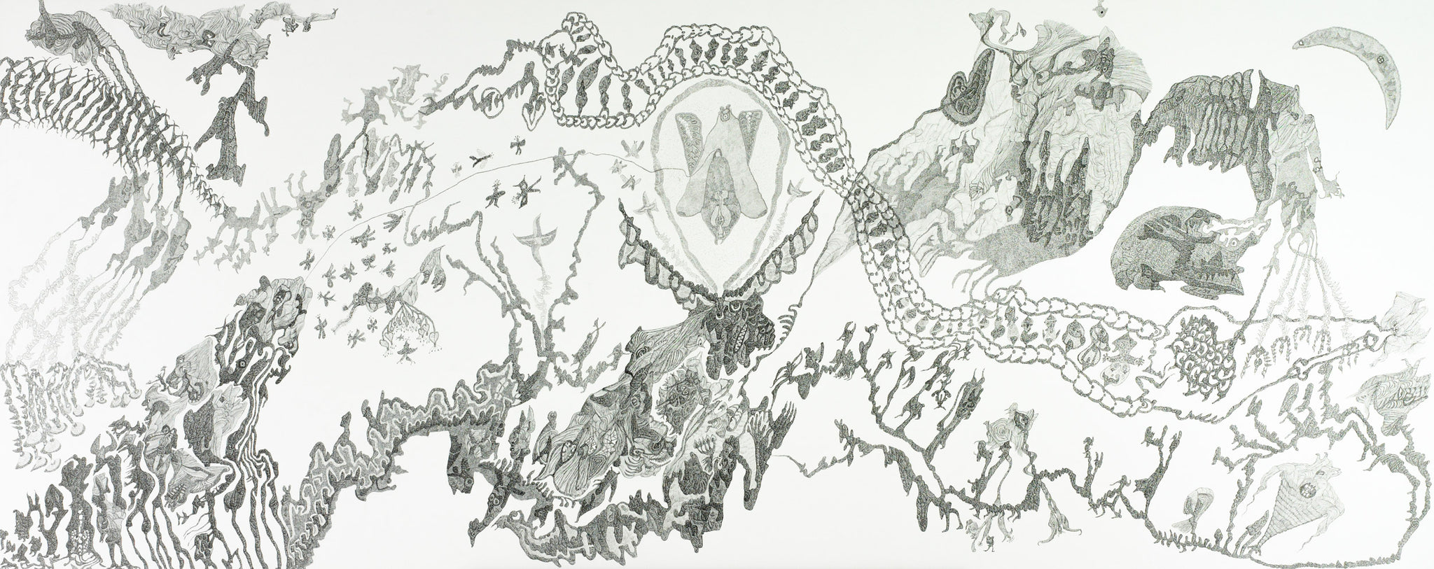 “Roccoco Cefirius Mazoomas” by Alfred Neumayr is a monumental ink-on-canvas drawing that stretches across three meters of detail, rhythm, and imagination. Created in 2016, the work unfolds like a map of the subconscious, filled with intricate forms that suggest creatures, landscapes, chains, and symbolic figures, all rendered in the artist’s signature fine-lined style.