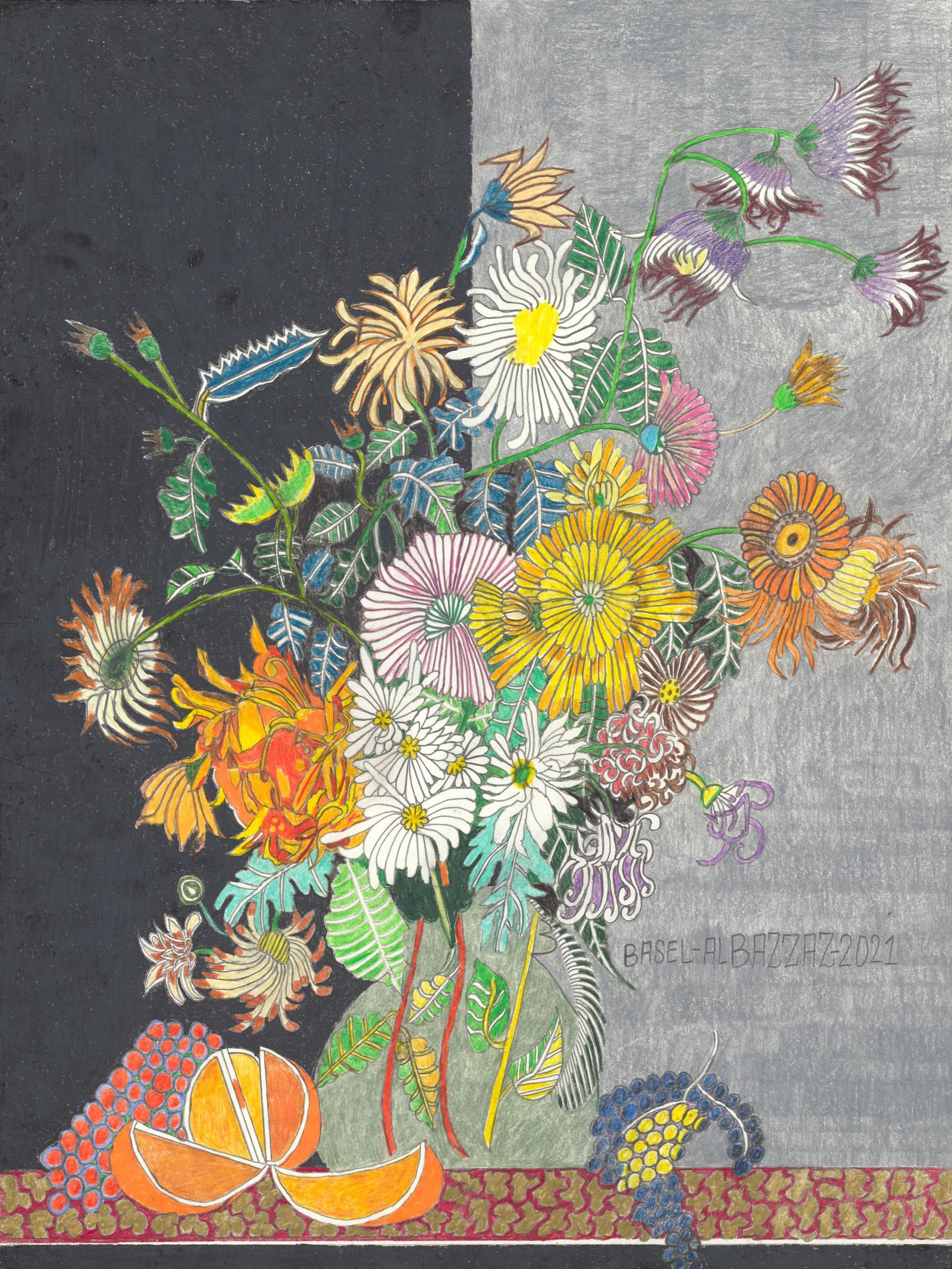 Basel Al-Bazzaz wurde 1973 in Bagdad, Irak, geboren und lebt seit 1990 in Österreich. Seit 2000 arbeitet er in einer sozialtherapeutischen Druckwerkstatt. Al-Bazzaz lässt Ornamente in feinen, detailreichen Papierarbeiten heranwachsen, die eine besondere Wirkung auf die Betrachtenden ausstrahlen. Mit Aquarellfarben, Bleistift und Farbstiften Kunstwerke entstehen zu lassen ist seine Passion und bereitet ihm am meisten Freude, so der Künstler. Er schätzt sein Leben in Österreich und doch hat er Sehnsucht nach dem Orient, die auch in seinen Werken Ausdruck findet. Als Inspirationsquellen dienen dem Künstler hauptsächlich die Natur sowie große Künstlerpersönlichkeiten wie Frida Kahlo. Seine Werke befinden sich in privaten Sammlungen.