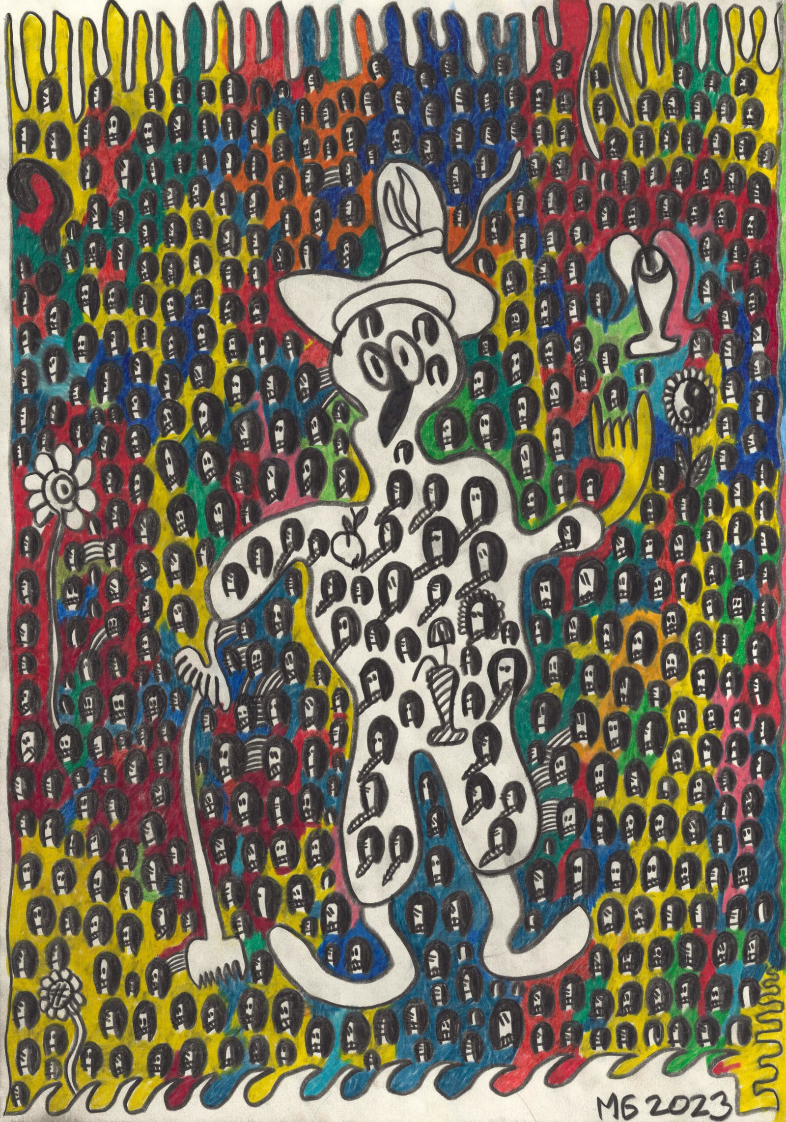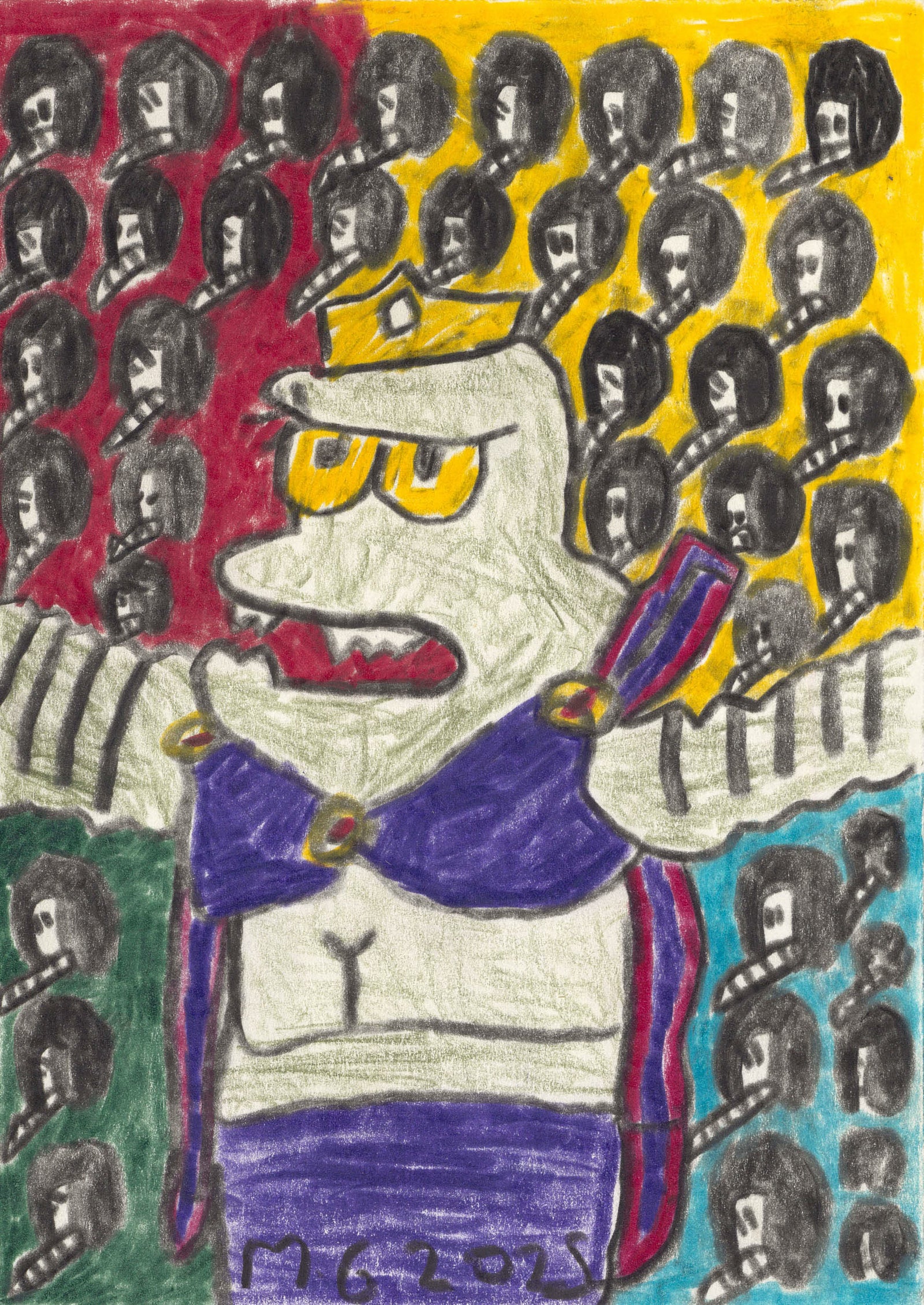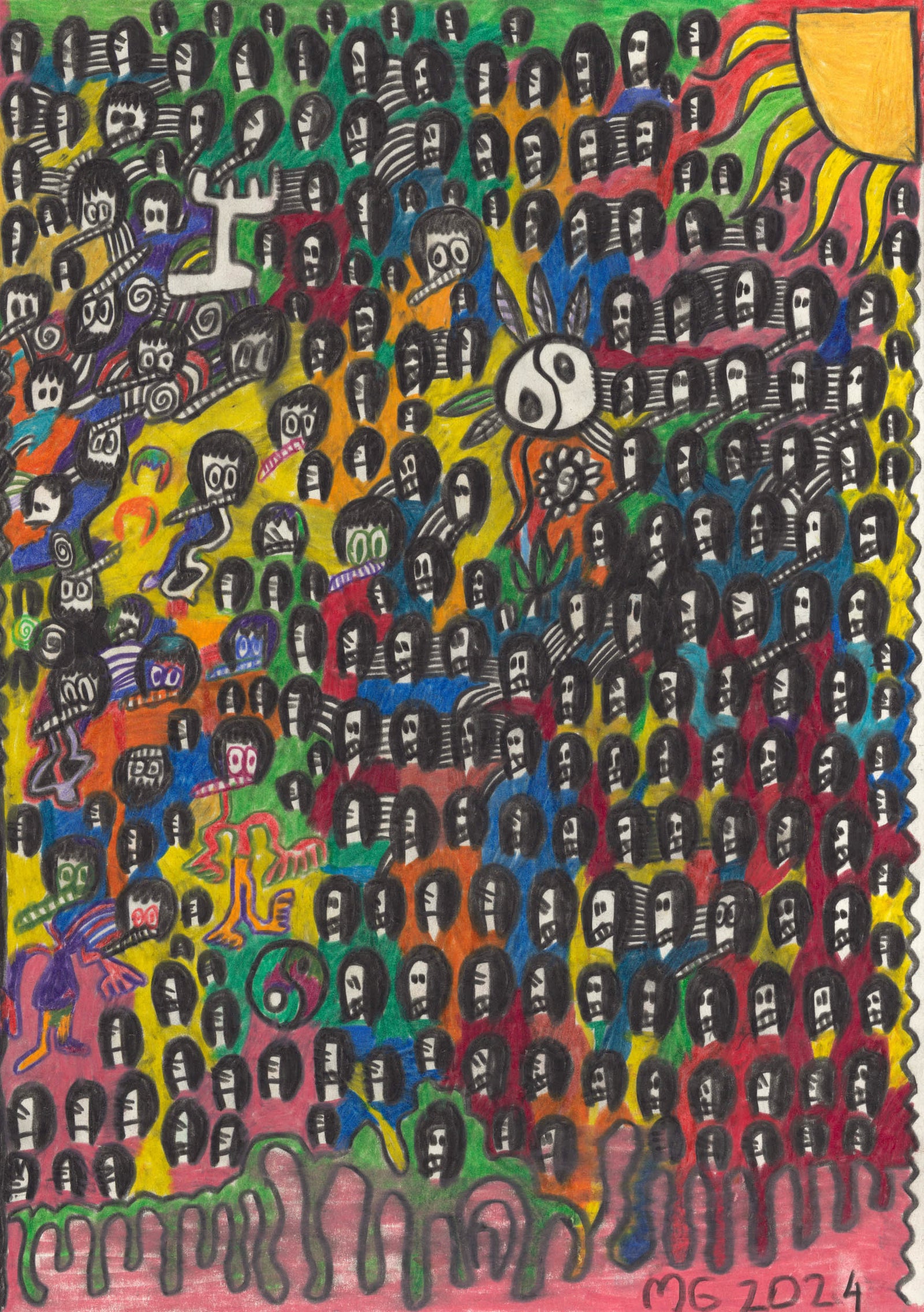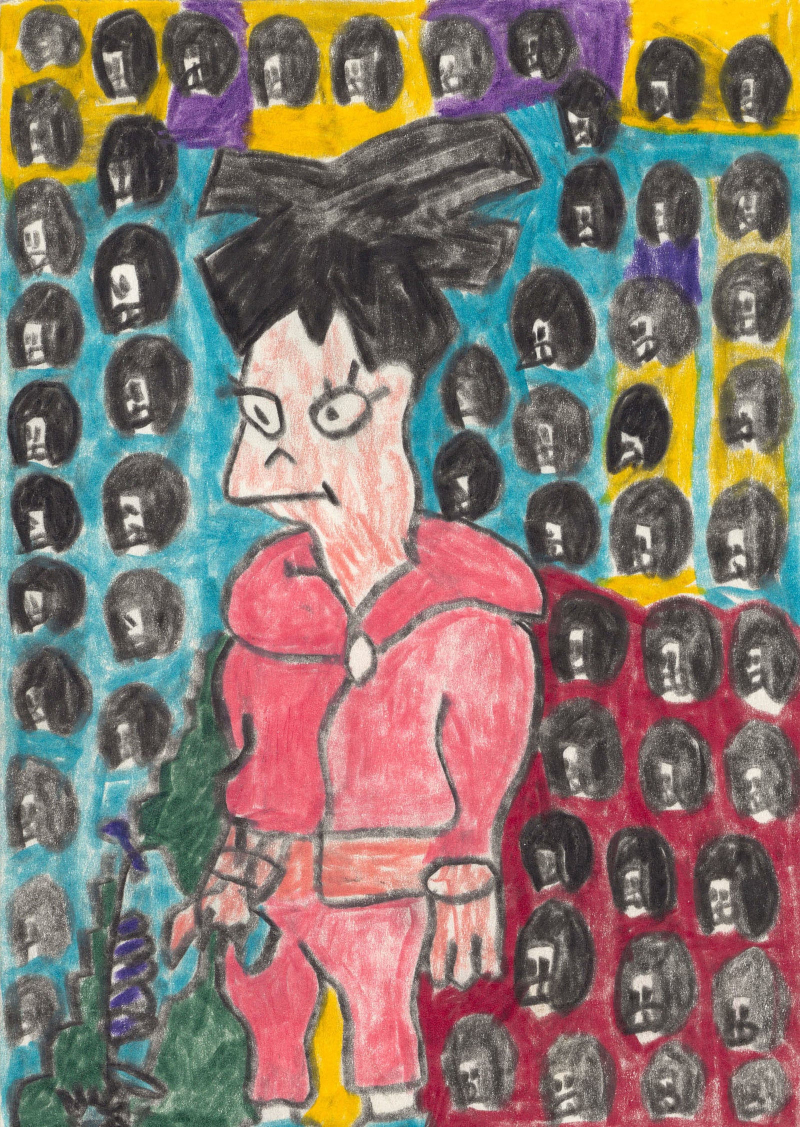 Manuel Griebler wurde 1991 in Kirchdorf, Österreich, geboren und lebt seit 2016 im Haus der Künstler. Anfänglich brachte er mit Bleistift und Ölkreide oft blattfüllende Gesichter mit wildem und dichtem Strich in mehreren Schichten aufs Papier. Bald ging er jedoch dazu über, ausschließlich Farbstifte zu verwenden und mit hohem Druck aufs Blatt farbintensiv zu arbeiten. Die Werke von Manuel Griebler werden dominiert von kleinen Köpfen, die sich, in alle Himmelsrichtungen blickend, über das Blatt verteilen. Zwischen den Köpfen finden eigenwillige Gestalten, Regenbögen, Duschen, Sonnen, Kräne und alles, was dem Künstler sonst noch in den Sinn kommt, Platz. Sein bevorzugtes Format ist das A3-Format, allerdings arbeitet er mittlerweile auch auf kleineren und größeren Formaten und hat Freude an mehrteiligen Gesamtwerken entdeckt. Grieblers Werke sind bereits in zahlreichen privaten Sammlungen zu finden.