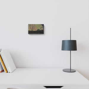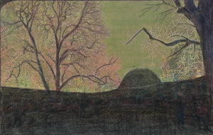 Leopold Strobl overlays coloured pencil onto a found newspaper clipping, reshaping the printed surface into a landscape of strong contrasts. Bare trees extend across the composition, their fine branches standing out against a soft green sky. A dark form rises on the horizon, balanced by luminous outlines of foliage and a textured foreground. The work demonstrates Strobl’s meticulous process of layering pencil over newsprint, transforming everyday imagery into precise, small-format drawings.