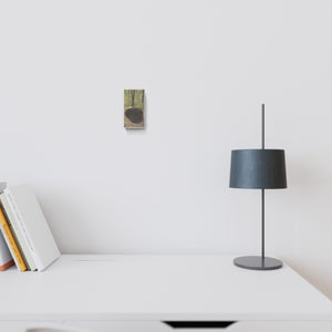 In this drawing, Leopold Strobl layers coloured pencil over a newspaper image to reshape the printed surface into a dense forest scene. Tall, slender trees rise vertically, their branches forming a textured canopy of greens. At the center foreground, a large dark oval form interrupts the landscape, rendered in rich layers of black pencil. The contrast between the natural setting and the bold form highlights Strobl’s precise technique and transformation of everyday imagery into a carefully structured composition.