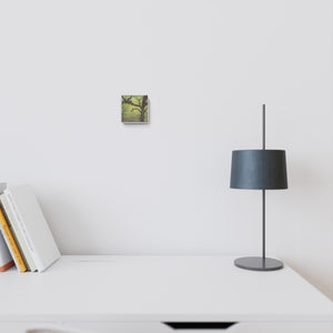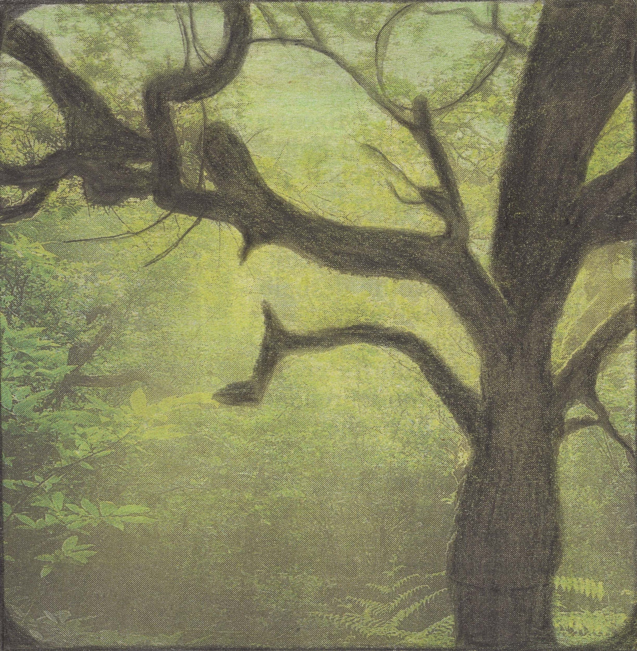 This drawing by Leopold Strobl presents the silhouette of a large tree dominating the foreground, its thick trunk and angular branches extending across the composition. The background is filled with lush greenery, softly illuminated in shades of yellow and green, giving depth to the dense foliage. By layering coloured pencil over a printed newspaper image, Strobl transforms the surface into a detailed, atmospheric woodland scene. The interplay between the bold dark forms of the tree and the lighter textured background demonstrates his precise technique and consistent approach to reworking everyday materials.