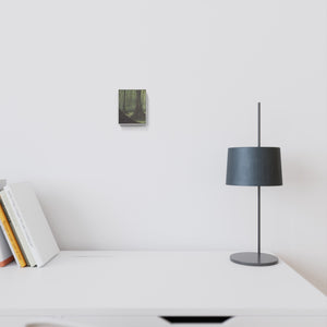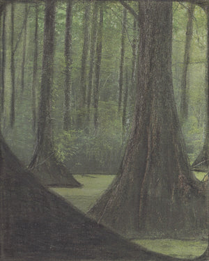 Leopold Strobl layers coloured pencil over newsprint to depict a dense woodland, where tall trunks rise vertically through the composition. In the foreground, massive trees create strong dark forms that contrast with the lighter green foliage in the background. The pencil work integrates with the printed base, producing a sense of depth between shaded areas and illuminated forest growth. The result is a carefully balanced composition of vertical rhythm and tonal variation.