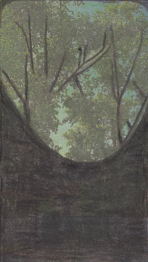 Coloured pencil is applied over a newspaper base to form a view framed by dense foliage. The upper half of the composition shows interlacing tree branches filled with green leaves, set against a pale blue sky. In the foreground, a dark curved form encloses the lower edge, creating a strong contrast with the lighter tones above. Strobl’s method of layering pencil transforms the printed image into a compact composition of structured shapes and tonal interplay.