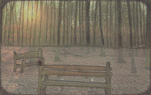 A woodland clearing is depicted with rows of slender tree trunks extending vertically across the composition. In the foreground, benches occupy the leaf-covered ground, their angular forms contrasting with the organic rhythm of the forest. Light filters through the upper left, casting a soft glow that interacts with Strobl’s dense pencil overlays. By working coloured pencil over the newspaper base, Strobl merges human-made structures with natural surroundings, producing a carefully balanced scene on an intimate scale.