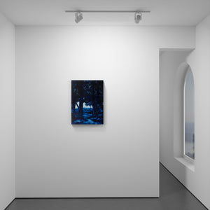 Rendered entirely in deep shades of blue, this oil painting presents a wooded landscape where tall trees frame an opening onto a rolling hillside. The brushwork varies between dense, textured strokes in the foliage and smoother passages in the sky, creating contrast between shadow and light. The absence of warm tones heightens the monochromatic depth, allowing subtle shifts in blue to define both terrain and atmosphere.
